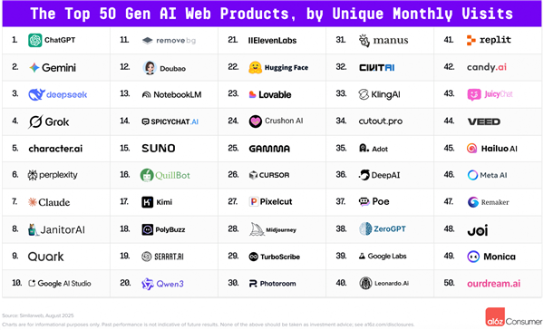 全球出名风险投资公司Andreessen Horowitz(简称A16z)发布全球Top100消费级生成式AI使用榜单。网页排行榜上,夸克Quark别离位列第三名、第九名;近日,多家中国公司上榜。